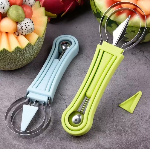 Transforma la preparación de tus frutas en un momento divertido, práctico y profesional con nuestro set de herramientas 4 en 1 de acero inoxidable. Ideal para hacer desde ensaladas y postres hasta decoraciones sorprendentes para tus platos.